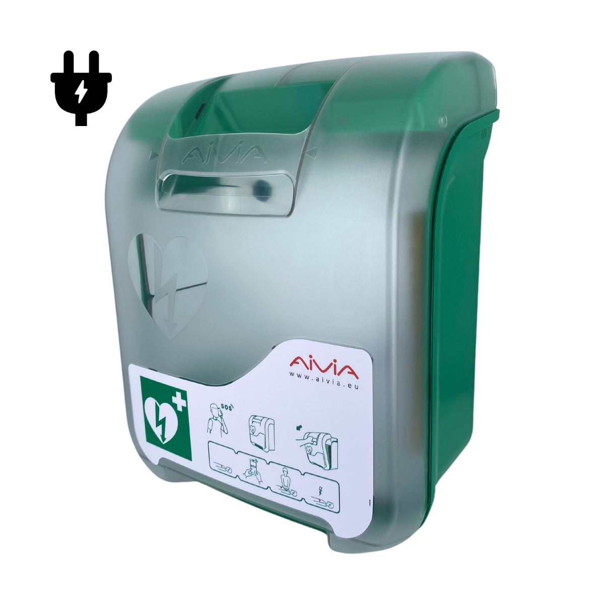 Szafka Aivia 200 dedykowana jest do przechowywania defibrylatora AED na zewnątrz budynku. Z uwagi na wbudowany moduł grzewczy oraz chłodzący, utrzyma właściwe warunki dla baterii urządzenia zarówno podczas mrozów jak i upałów. Produkt spełnia normę IP54 co oznacza, że jest odporny na strumień bryzgającej wody oraz wnikanie do środka obiektów większych niż 1 mm. Szafka została wyposażona w alarm dźwiękowy oraz świetlny, które załączają się po otwarciu pokrywy.